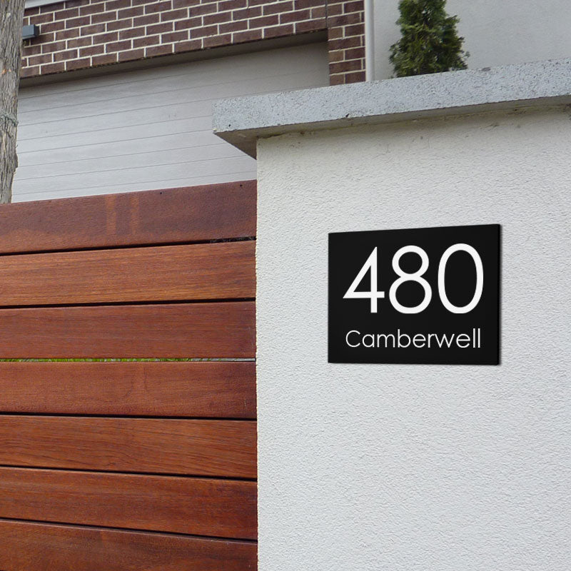 Your custom house sign is easy to install – simply use some construction adhesive from a hardware store (eg Liquid Nails Heavy Duty), apply to the back of your sign (ensuring you stop 2cm from the edges), and adhere to your surface.