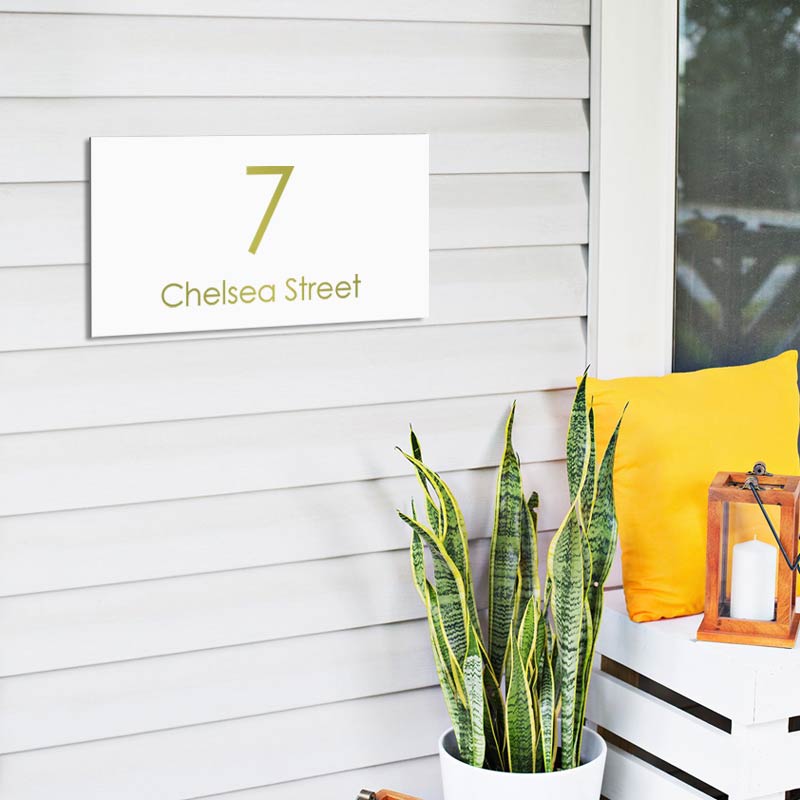 Your custom house sign is easy to install – simply use some construction adhesive from a hardware store (eg Liquid Nails Heavy Duty), apply to the back of your sign (ensuring you stop 2cm from the edges), and adhere to your surface.